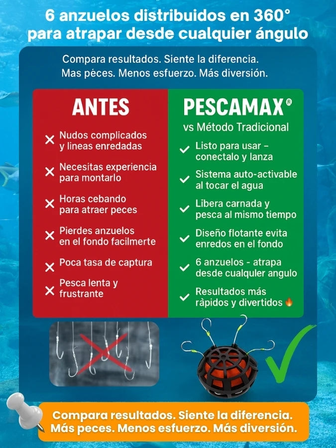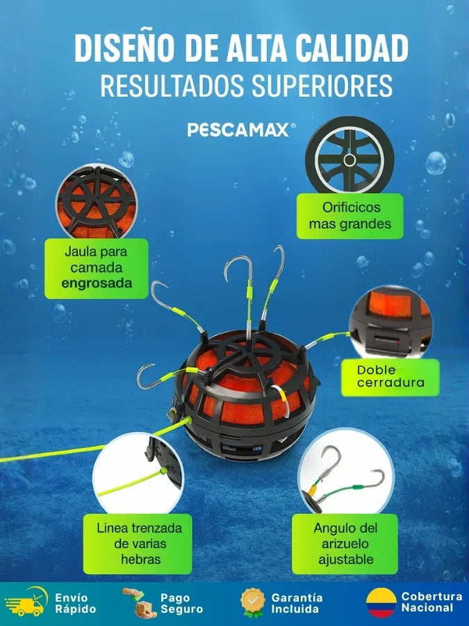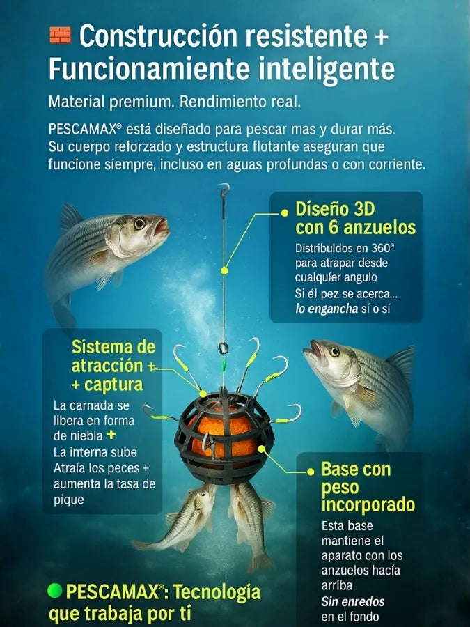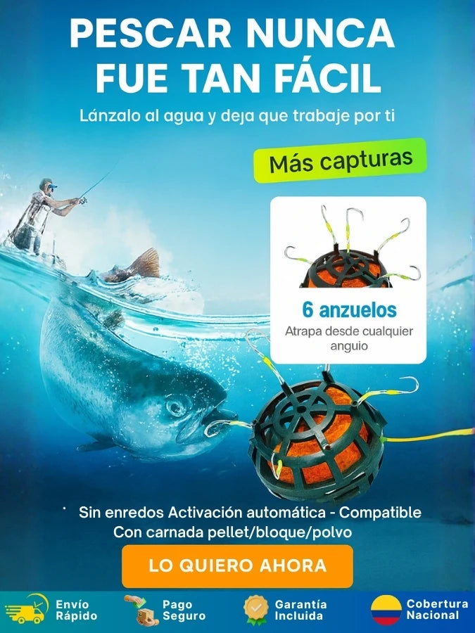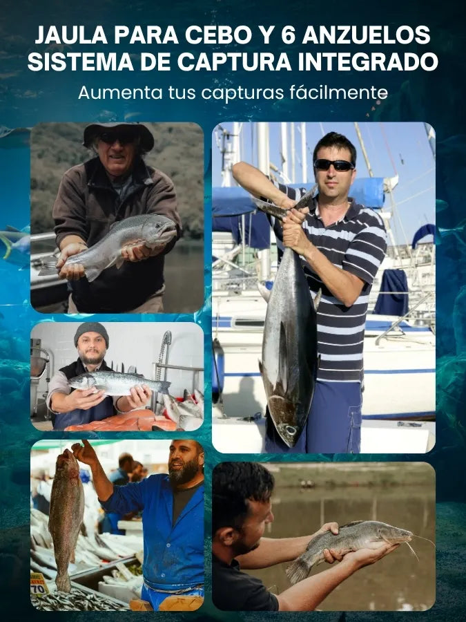 Cuenta con 6 anzuelos estratégicamente distribuidos para capturar desde cualquier ángulo sin que el pez sospeche.