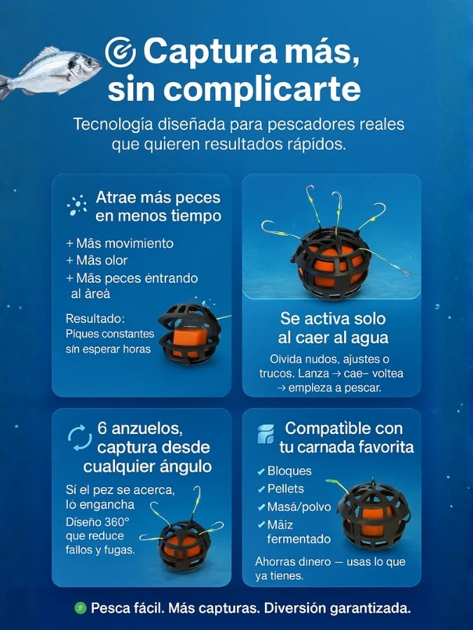 Se activa automáticamente al tocar el agua y prepara la carnada por ti.